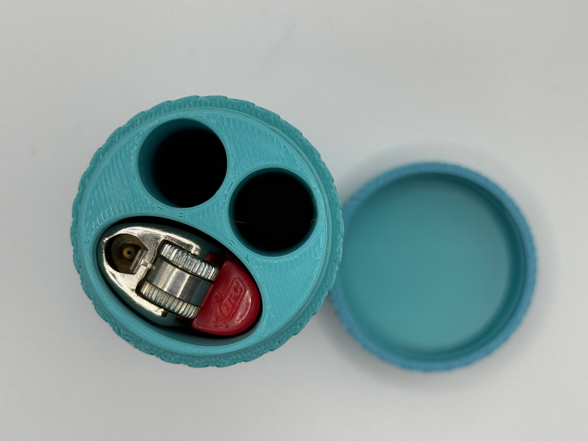 This stash container holds the standard Bic Classic along with two of your favorite smokes. It has a textured feel for extra grip. Designed and made in house.